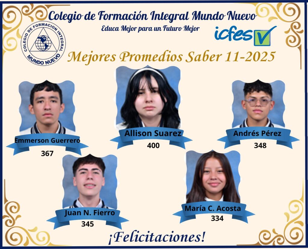 El Colegio de Formación Integral Mundo Nuevo expresa su más sincera felicitación a los cinco primeros puestos del ICFES 2025, quienes, con esfuerzo, disciplina y compromiso, han dejado en alto el nombre de nuestra institución. Su dedicación refleja los valores que promovemos cada día: la excelencia, la perseverancia y el amor por el aprendizaje. Ustedes son un ejemplo para toda la comunidad educativa y una inspiración para sus compañeros, demostrando que los sueños se alcanzan con trabajo constante y confianza en las propias capacidades. Nos sentimos profundamente orgullosos de este logro, fruto de su constancia y del acompañamiento de sus familias y docentes. ¡Gracias por representar con orgullo el espíritu del Mundo Nuevo!