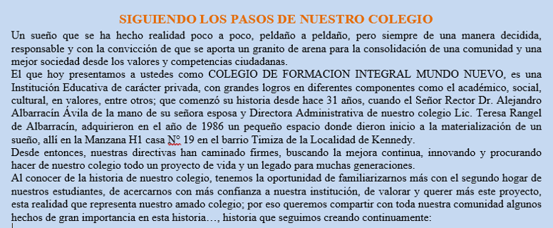 El que hoy presentamos a ustedes como COLEGIO DE FORMACION INTEGRAL MUNDO NUEVO, es una Institución Educativa de carácter privada, con grandes logros en diferentes componentes como el académico, social, cultural, en valores, entre otros; que comenzó su historia desde hace 31 años, cuando el Señor Rector Dr. Alejandro Albarracín Ávila de la mano de su señora esposa y Directora Administrativa de nuestro colegio Lic. Teresa Rangel de Albarracín, adquirieron en el año de 1986 un pequeño espacio donde dieron inicio a la materialización de un sueño, allí en la Manzana H1 casa N° 19 en el barrio Timiza de la Localidad de Kennedy.