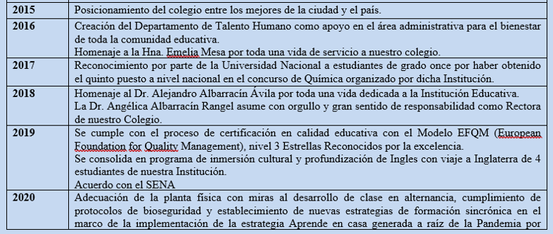 Desde entonces, nuestras directivas han caminado firmes, buscando la mejora continua, innovando y procurando hacer de nuestro colegio todo un proyecto de vida y un legado para muchas generaciones.